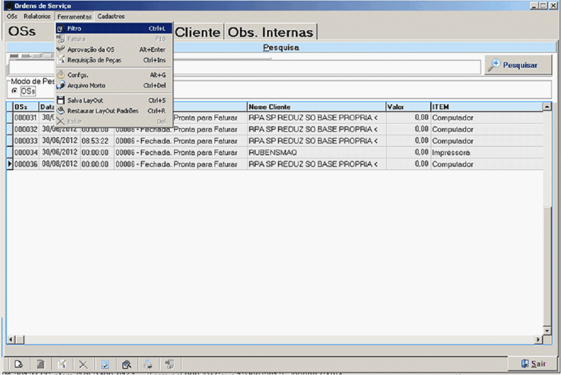 Código do ClientC: Defina o código do clfente que deseja filtrar as OS;