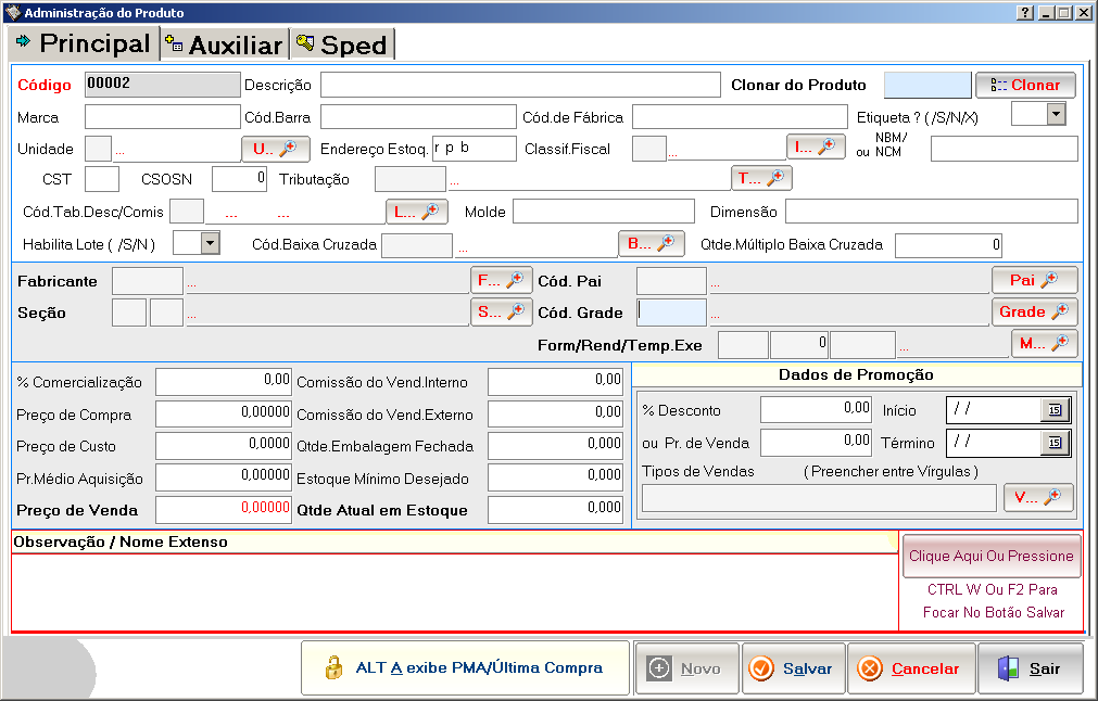 Preço de Venda – Preço de venda do produto. Pode ser alimentado manualmente, ou deixado em branco para que seja preenchido automaticamente, através da utilização do Preço de Custo + % de Comercialização.