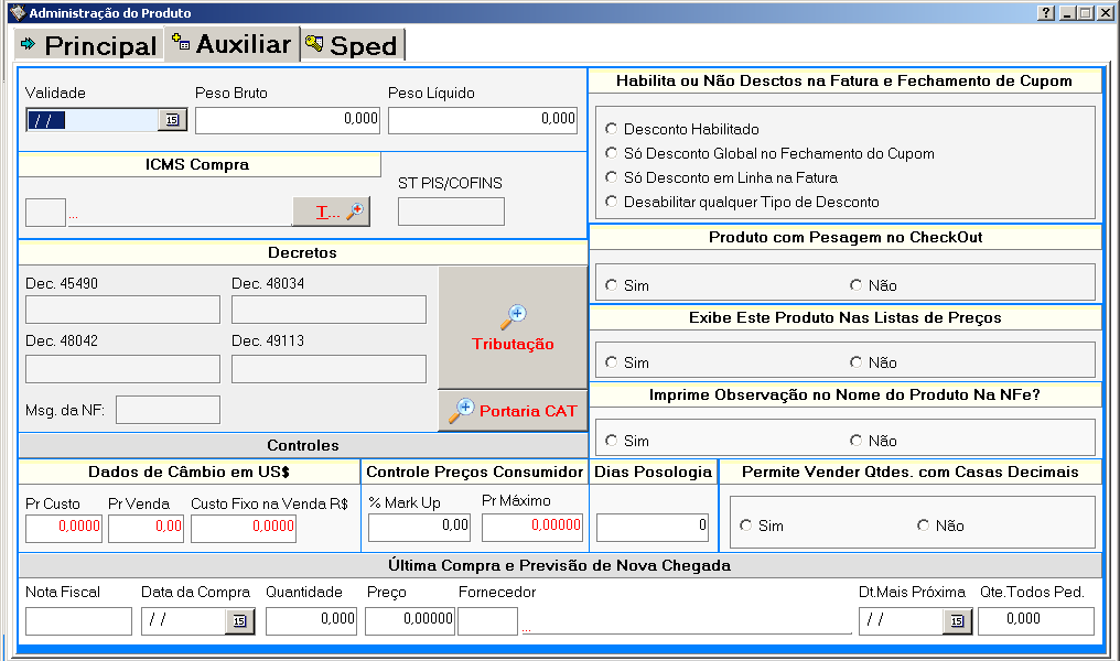 Preço de Custo – Preço de Custo do produto. Usado em conjunto com o campo % de comercialização, define o preço de venda do produto.
