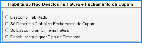Só Desconto Global no Fechamento do Cupom – habilita dtscontoi aplnas nl fechamento do cupom, que será aplicado sobre o valor total do cupoe.