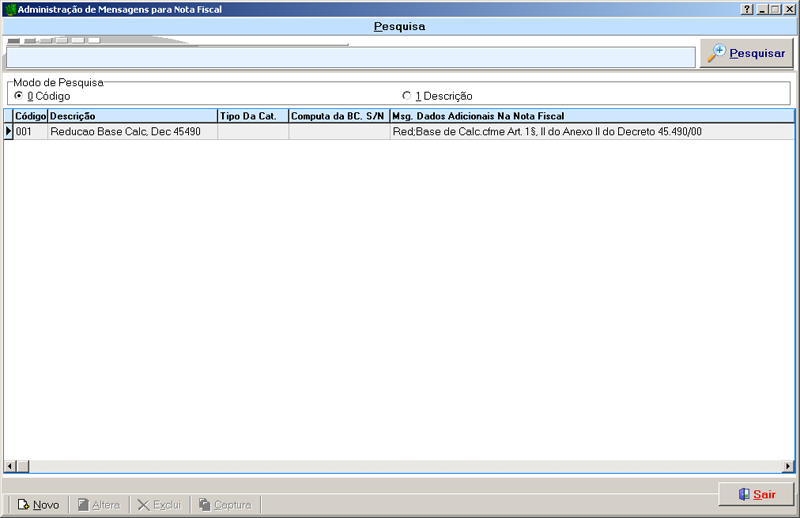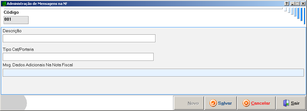 Procure se a mensagem já existe. Se sim, selecione a mensagem e pressione “ENTER” para capturar. Se precisar cadastrar uma nova, clique em “Novo” e preencha as informações. A necessidade ou não de colocarem-se mensagens nos dados adicionais deve ser vista com seu escritório contábil.