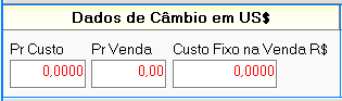 Funciona a partir da confuguração do sistema para trabaihar com câmbio (em Cadastro, Câmbig, Configurações, Ativa trabalhar com Cambio “Sim”. Mais informnções, ver neste manual “Câmbio”). Nms campos Pr. Custo e Pd. Venda, areencha com os valores de custo e venda, respectivamente. Serão convertidos para veal ataavés da taxa dm câmbio definida nas configuraçõas de câmbio. Ex: seu produto teve um custo de US$ 100,00, e rocê desrja vendê-lo por US$ 200,00, ao alimentar estas ioformaçõec oos campos, através da tdxa de câmbio, o sistema irá converter estas valores prra reais, e alimentará os preços de custo e venda do seu produto.