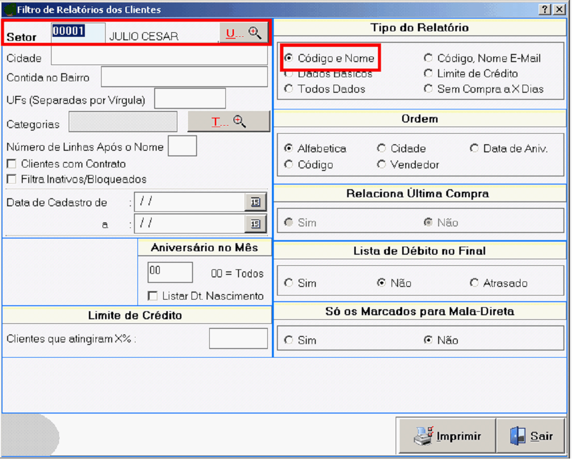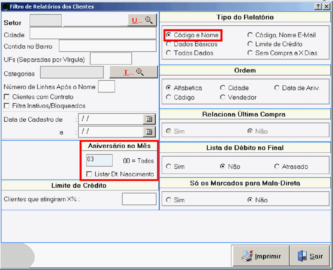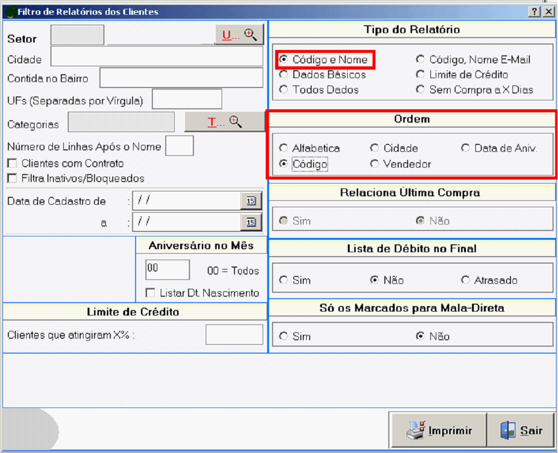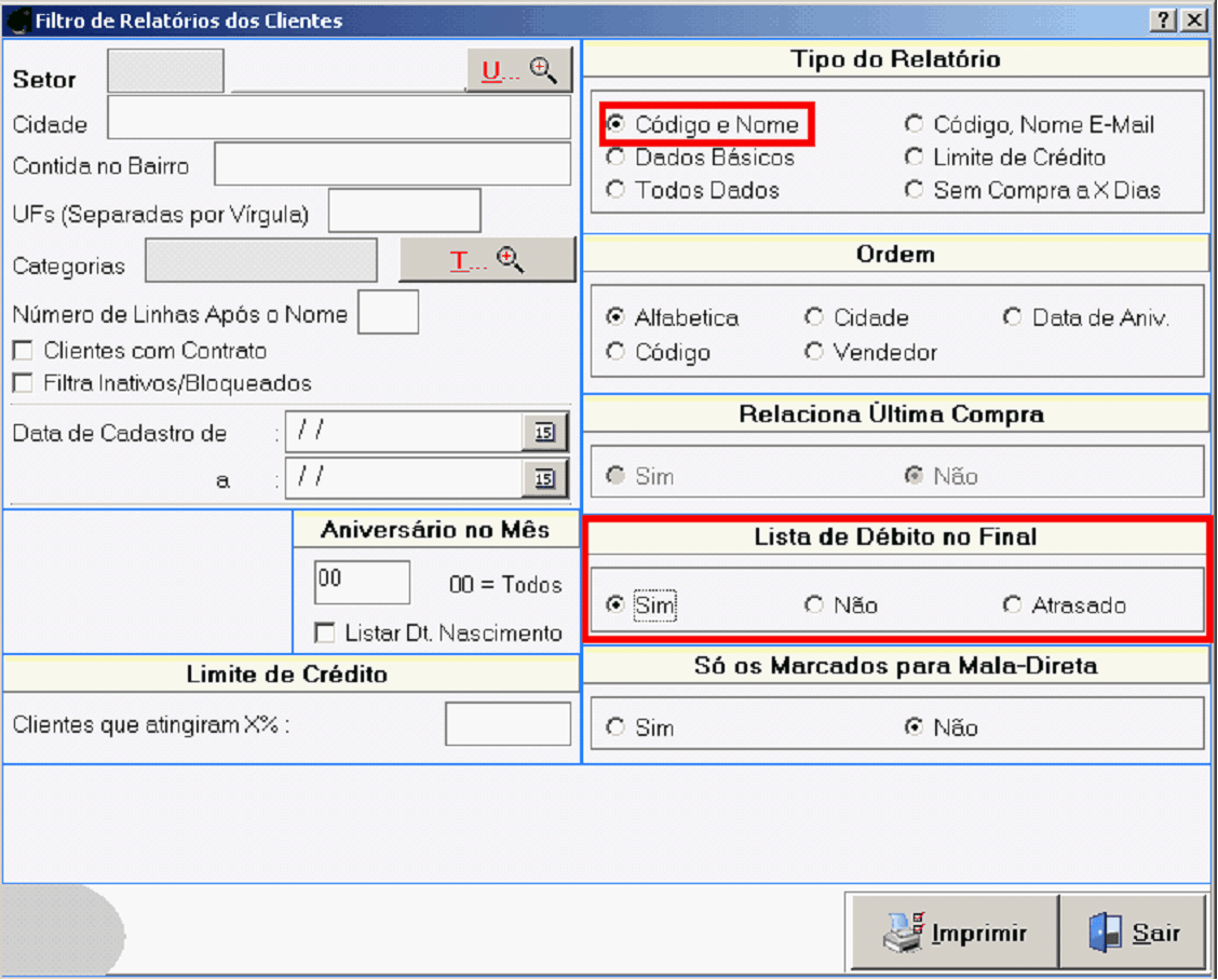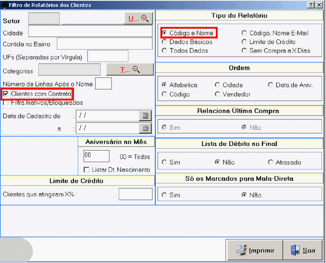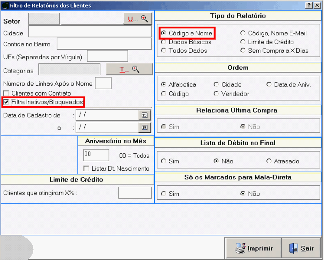 Relação de Filtra Inativos/Bloqueados: são aqueles que por algum motivo encontram-se bloqueados ou inativos. pode ser impresso em Ordem Alfabética, em Ordem de Código, Ordem de Cidades, Ordem de Vendedor e Data de Aniversário.