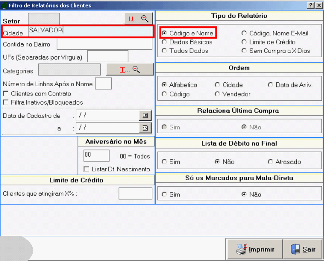 Relação de clientes por cidade, pode ser impresso em Ordem Alfabética, em Ordem de Código, Ordem de Cidades, Ordem de Vendedor e Data de Aniversário. Ex: Apenas clientes da cidade de Salvador em Ordem Alfabética.
