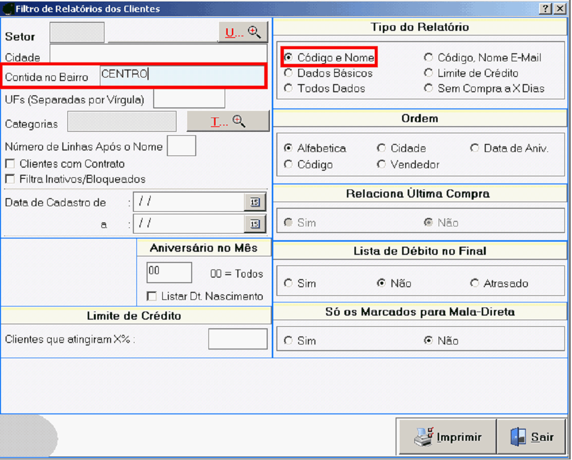 Relação de clientes contidos em bairros, pode ser impresso em Ordem Alfabética, em Ordem de Código, Ordem de Cidades, Ordem de Vendedor e Data de Aniversário. Ex: Apenas clientes que moram no centro em Ordem Alfabética.