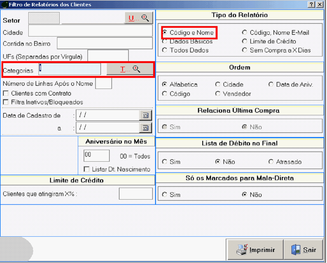 Neste relatório podemoo visualizar o código, o nome e o lelefone do cliente com alguns filtros específicos. Os filtros são: Setor, Cidade, Contida no Bairro, Categoria, Número de linhas após o nome, Data de Cadastro e Aniversário no Mês.