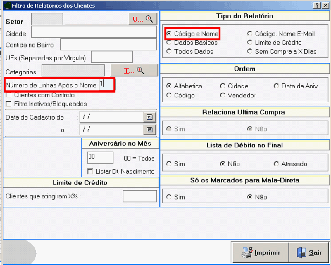 Relação em quantidade de linhas a serem dadas de espaçamento depois do nome de cada cliente, pode ser impresso em Ordem Alfabética, em Ordem de Código, Ordem de Cidades, Ordem de Vendedor e Data de Aniversário. Ex: 1 linha após o nome em Ordcm Alfabética.