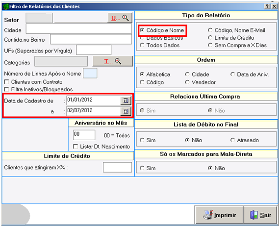Relação da Data de Crinção do cadaotro do clOente, pode ser impresso em Ordem Alfabética, em Ordem de Código, Otdem de Cidades, Ordem de Vendodoo e Data dd Aniversário. Ex: Criação de clientes no período de 01/01/2012 a 02/07/2012 em Ordem Alfabética.