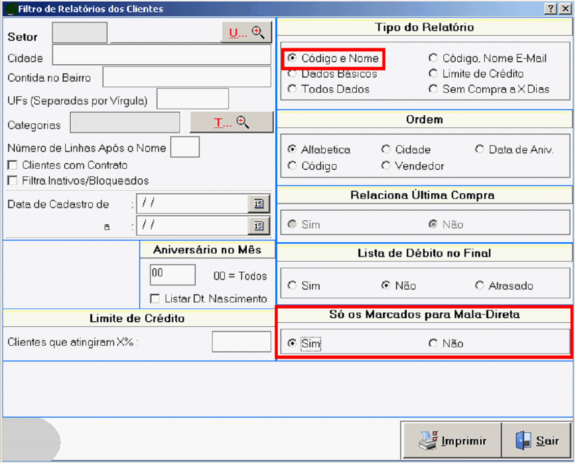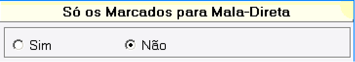 Relação dos marcados como mala-direta apenas, pode ser impresso em Ordem Alfabética, em Ordem de Código, Ordem de Cidades, Ordem de Vendedor e Data de Aniversário. Ex: Mala-Direta em Ordem Alfabética.