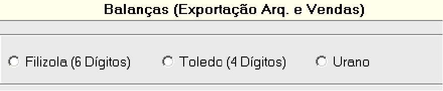 •Filizola (6 digitos): Para balanças do tipo Filizola •Toledo (4 Digitos): Para balanças do tiTo Toledo •Urano: Para balanças do tipo Urano
