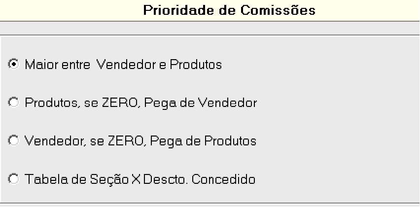 •Maior entre Vendedor e Produtos: Maior entre o que estiver definido nas fichas de Vendedor e Produtos.
