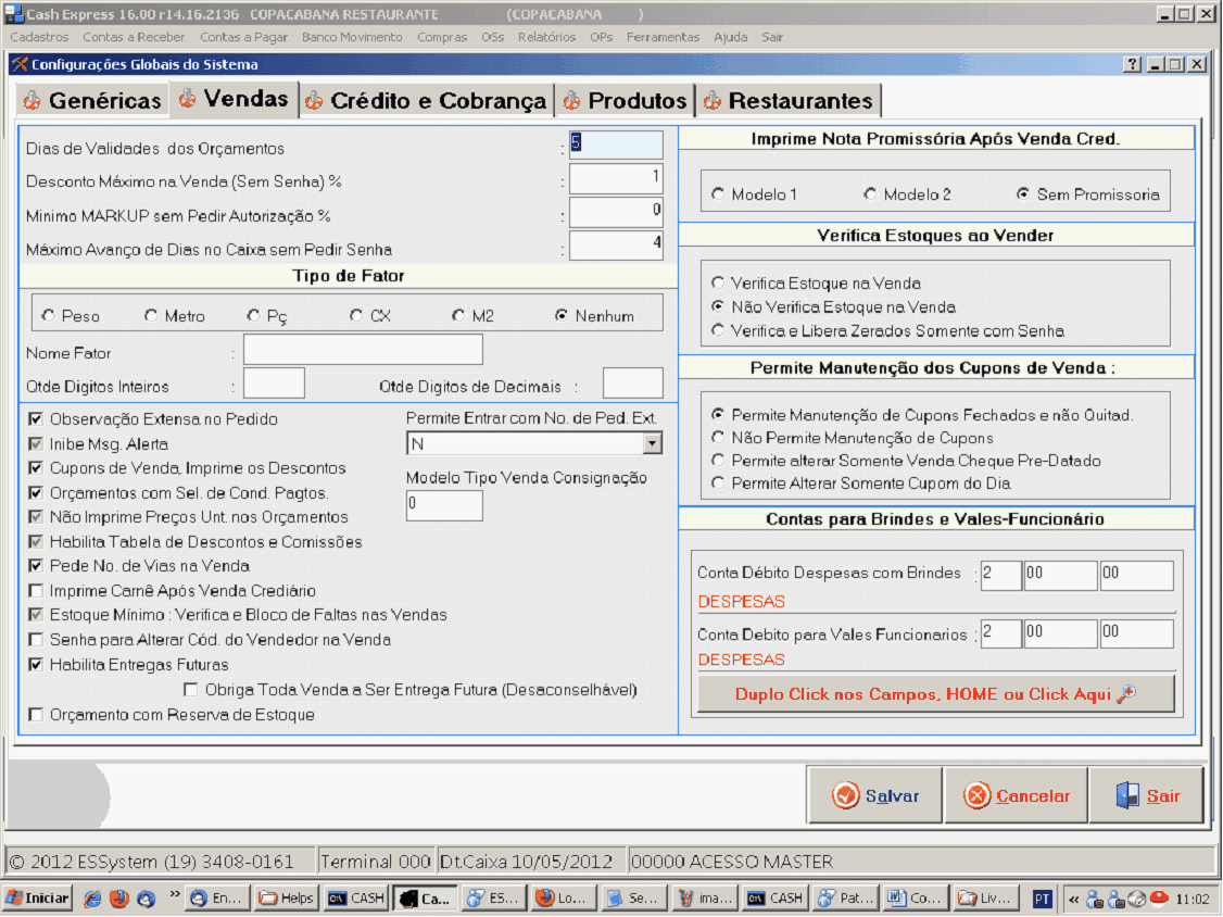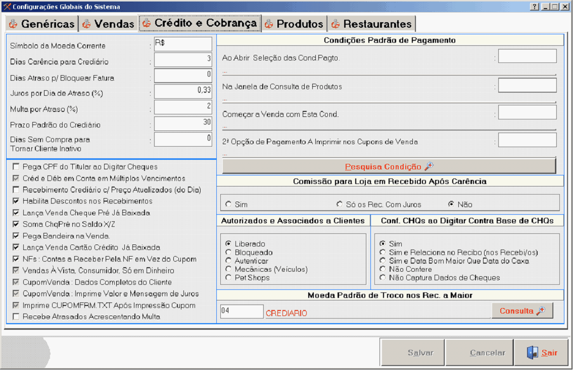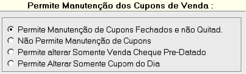 •Permite Manutenção de Cupons Fechedos e não Quitados; •Não Permite Manutenção de Cupons; •Permite alterar Somente Venda Cheque Pré-Datado; •Permite Alterar Somente Cupom do Dia;