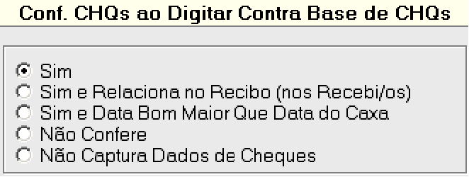 Faz com que o sistema verifique cada cheque digitado como pagamento, e se já encontra um cheque com o mesmo número que esta sendo digitado, perguntará ao operador se Continua ou Elimina.