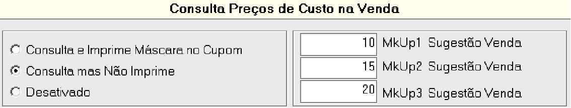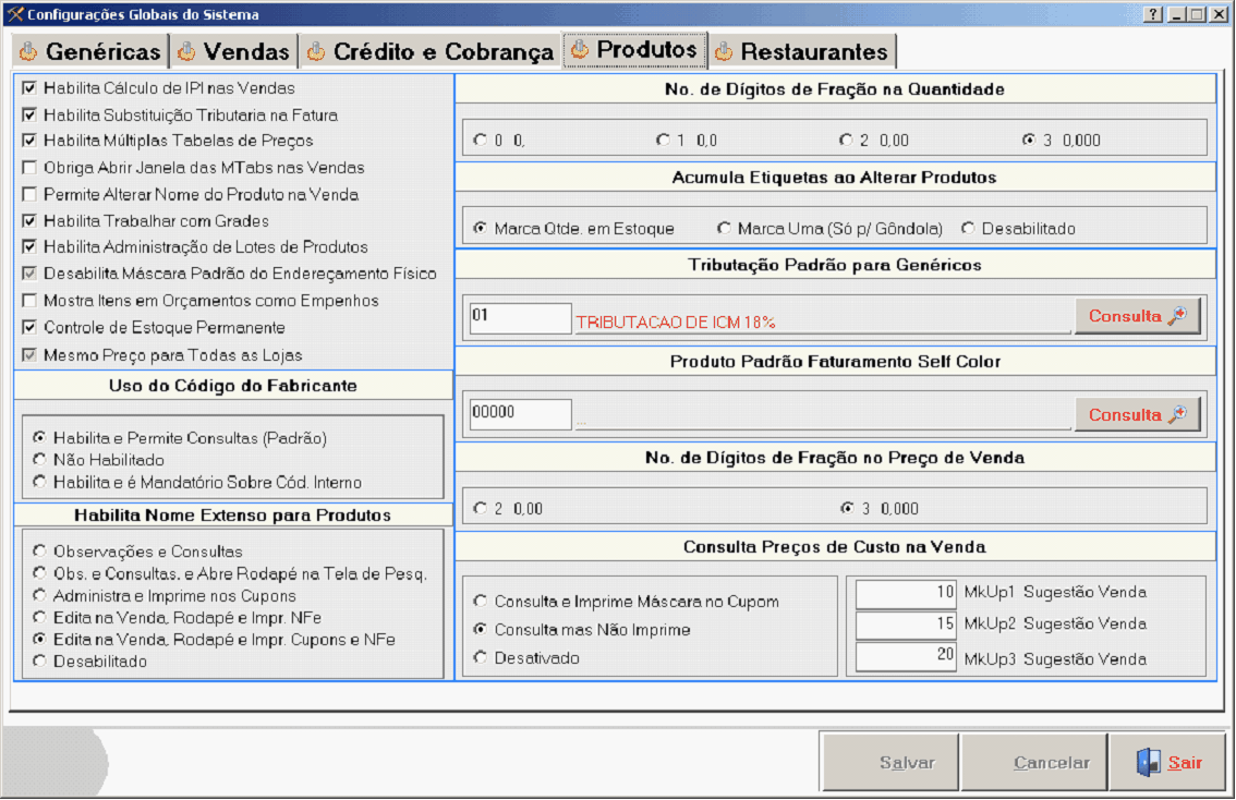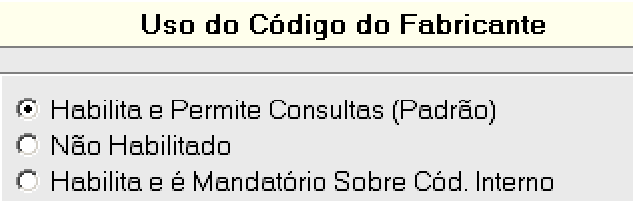 •Habilita e Permite Consultas (Padrão): Permite pesquisar pela ordem do código do seu Fabricante em vez do nome ou do código interno. •Não Habilitado: Elimina o campo nas edições de consulta. •Habilita e é Mandatório Sobre Cód. Interno: o código interno é desprezado na venda e na impressão de cupons
