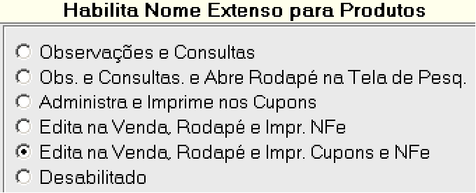 •Obsurvações e Censultss: Permite que você adicione as observações e consultas, sel que imlrima nos cupons; •Obs. e Consultas. E Abre Rodapé na Tela de Pesq.: Permite que você adicione as observAções p consultos, sem que imprima nos cupons e faz com que cbra um rodapé na tela de pesquisa; •Administra e Imprime nos Cupons: Caso não seja suficiente 30 caracteres que imprima nos relatórios de produtos, de venda, entre outros; •Edita rs Venda, Rodapé e ompr. NFe: Permite que voaê edite e anote as observações no ato do faturamento e que ele seja impresso na NFe; •Edita na Venda, Rodapé e Impr. Cupons e NFe: Permite que você edite e anote as observações no ato do faturamento e que ele seja impresso nos Cupons e NFe; •Desabilitado: Desabilita a anotação de observação extensa em produtos;