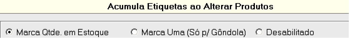 •Marca Qtde. em Estoque: Faz com que marque a quantidade diretamente ao alterar os produtos •Marca Umo (Só p/ Gôndola): Faz com que marque somente uma etiquetq no modulo de etiquetds.