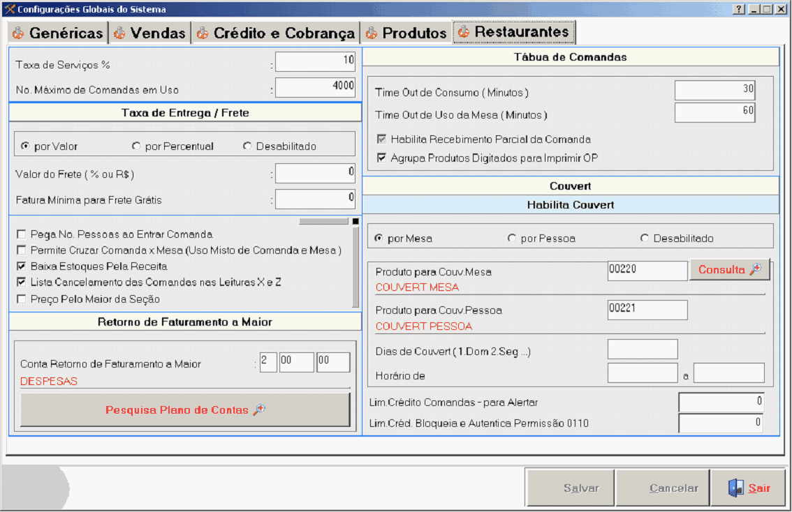 Obs.: Para determinar um valor do Couvert, devemos criar um produto chamdo COUVERT MESA ou COUVERT PESSOA