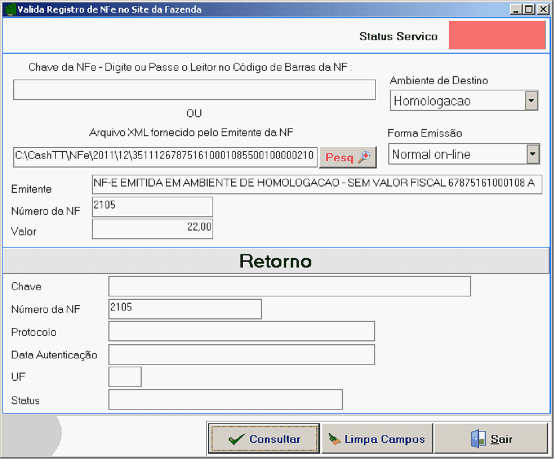 Após ter definido os dados da chave ou o arquivo XML clique em Consultar para concluir e retornar os dados.