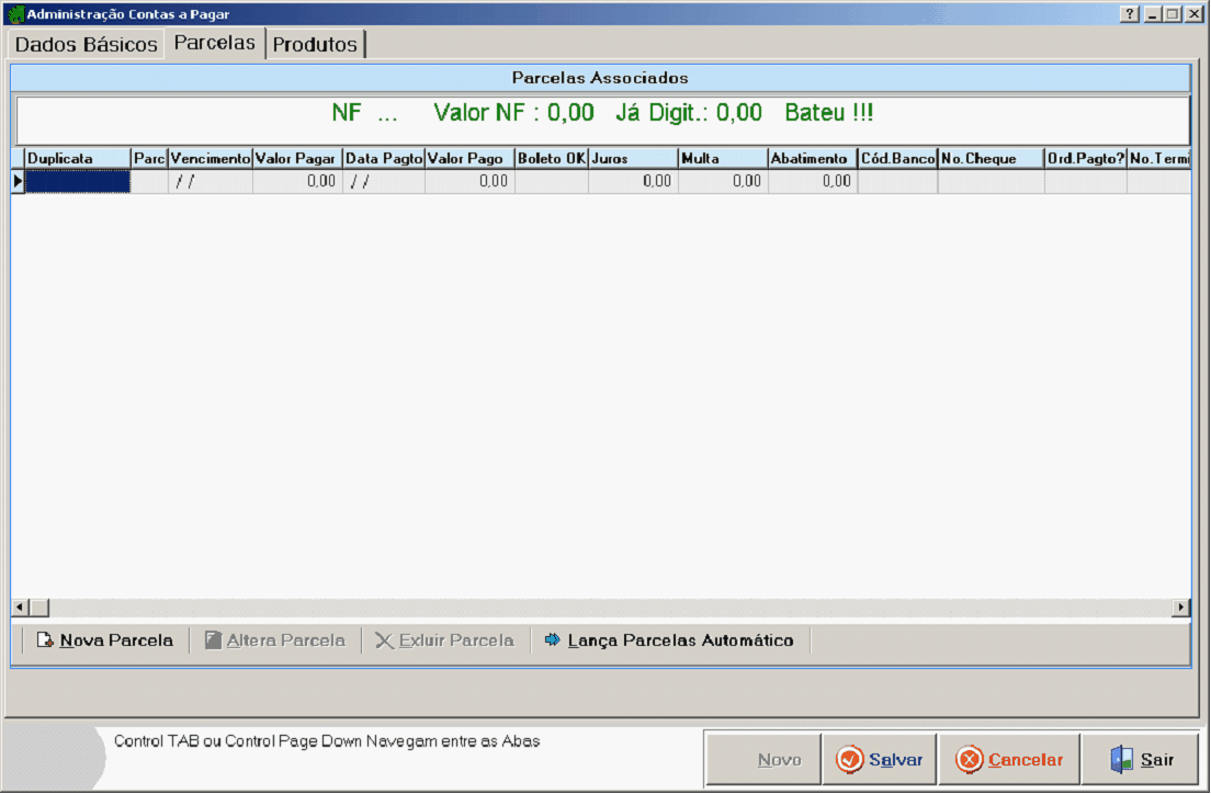 Falta Digitar: Valor total da NF, use como base caso for alterar o valor da primeira parcela ou as demais.