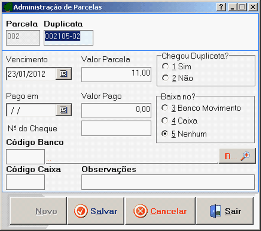 Parcela: Exibe automaticamente o número da parcela que está sendo feita.