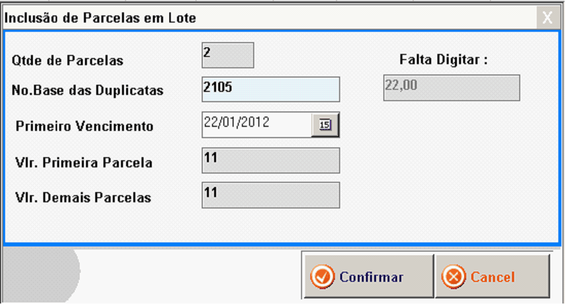Vlr. Primeira Parcela: Define o valor da primeira parcela, automaticamente o sistema irá dividir o valor da NF pelo número de parcelas.