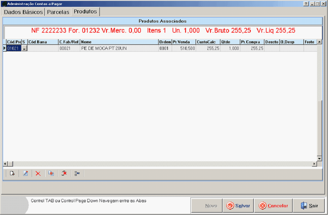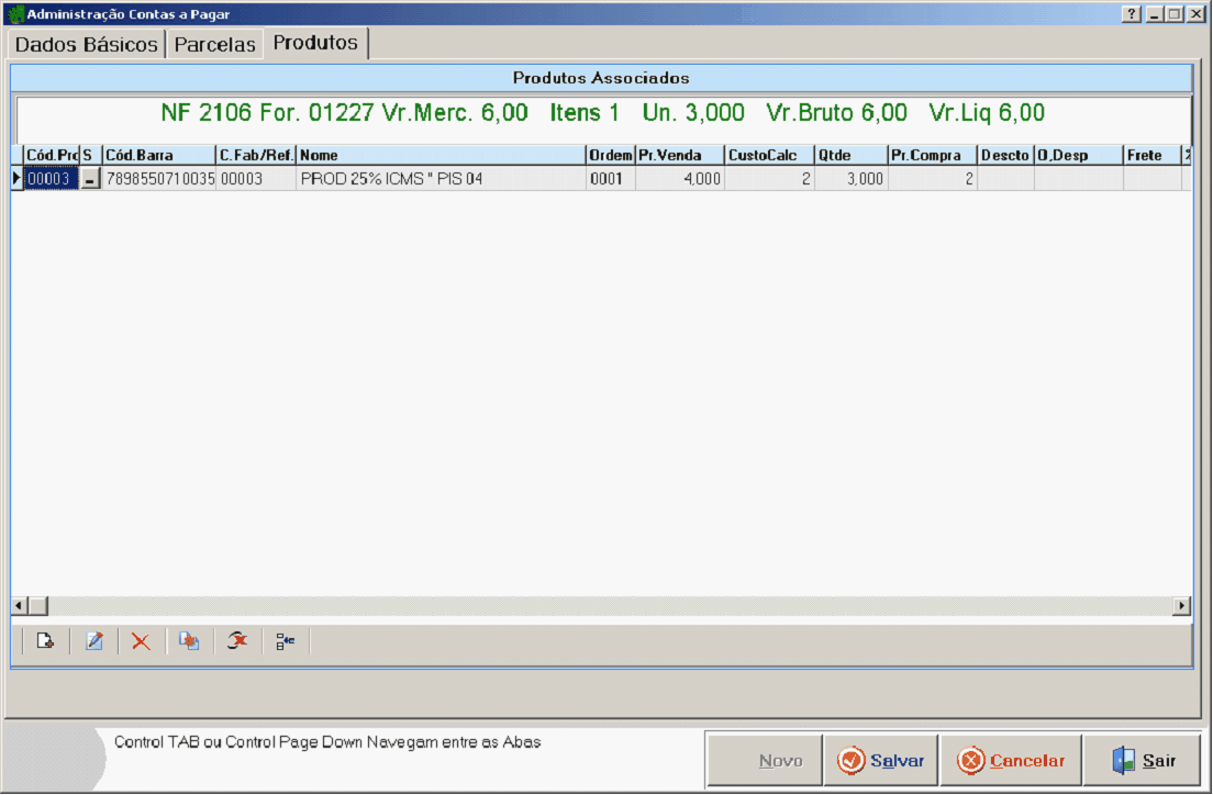 Deaois de ter colocado todas parcelss corretamente, iremos para aba de Produtos:
