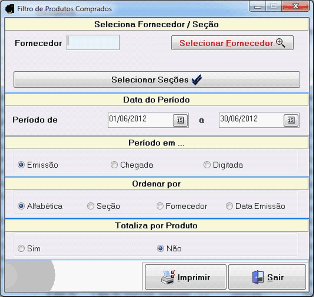 Levanta e Imprime os produtos comprados em um periodo, conforme as Seções e Fornecedores definidos por você. Pode também gerar um pedido de compra desses produtos.