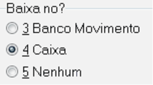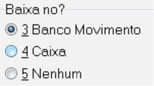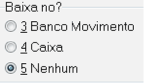 Baixa no? Onde você deseja que a baixa desse documento apareça? Selecione 3-Banco Movimento, ou 4-Caixa ou 5-Nenhum, você não quer que que o movimento apareça em lugar nenhum. Se você baixar no Caixa será feita automaticamente uma Sangria no terminal de Caixa que você informar, referente ao pagamento dessa duplicata. Idem para o movimento do Banco que você especificar, no Banco Movimento.