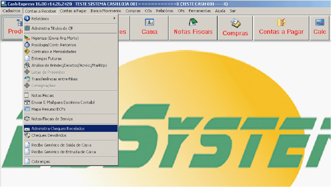 1.Abrir o VCash; 2.Contas a Receber; 3.Administra Cheques Recebidos;