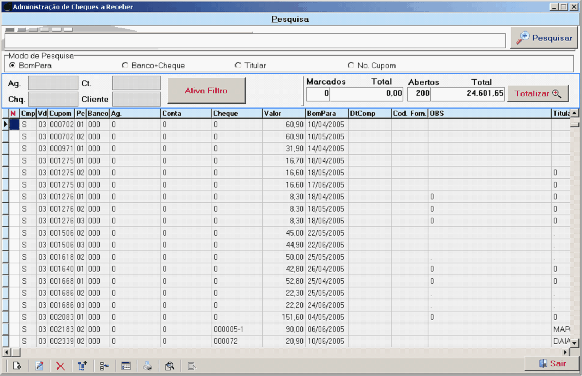 Essa tabela contém todos os cheques que foram digitados no sistema, quer nas vendas, quando você definir uma forma de pagamento Cheque, quer nos recebimentos, quando também você definiu que recebeu com Cheque. Ou seja, sempre que o sistema abriu a janela para digitar os dados de um ou mais cheques, e esses dados foram digitados, eles vieram para essa tabela.