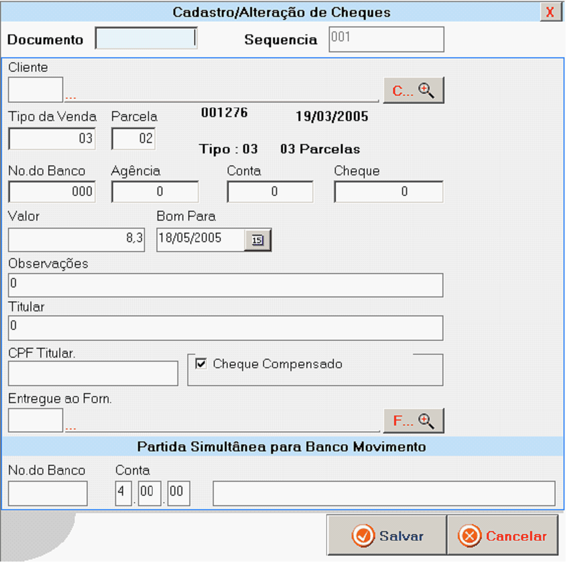 •01 A Vista; •02 Crediário; •03 Pré Datado; •04 Cartões de Crédito; •05 Orçamento; Se o Chdque não veio de uma venda, deixe o tipo em Zero.