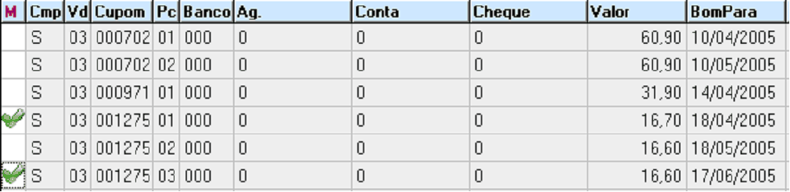 Para isso basta marcarmos os cheques, o campo M é abreviação de Marcado, os que estão com a marcação em verde significam que estão marcados;