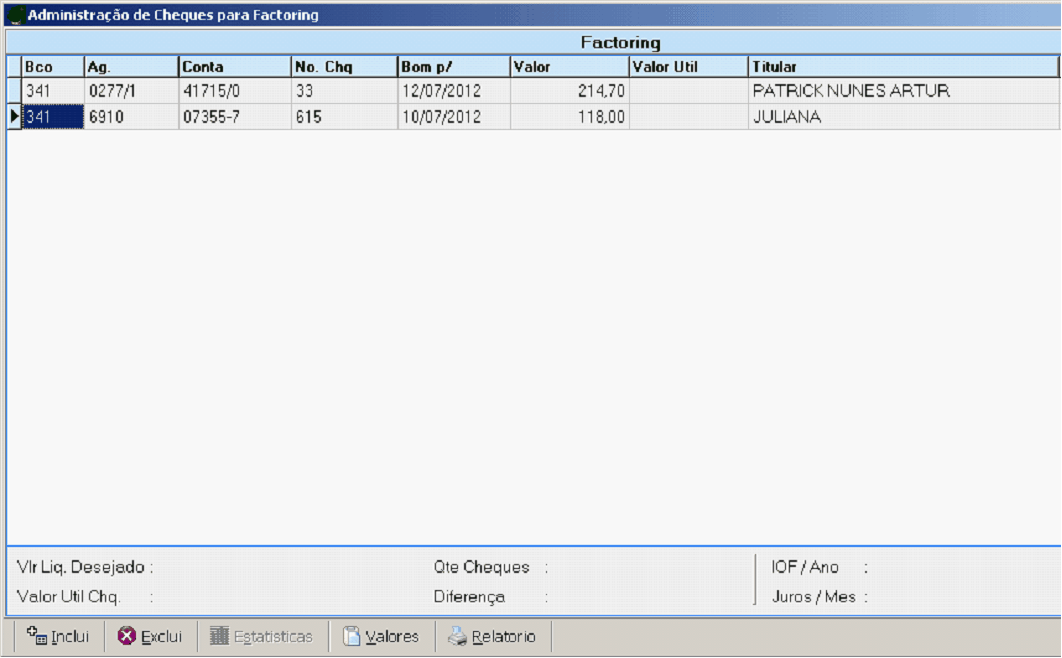 Factoring é o sistema para troca de cheques com banco ou empresas. Além disso você pode fazer análise de uma série de cheques para descobrir o prazo médio ou, o valor de abatimento dos mesmos.