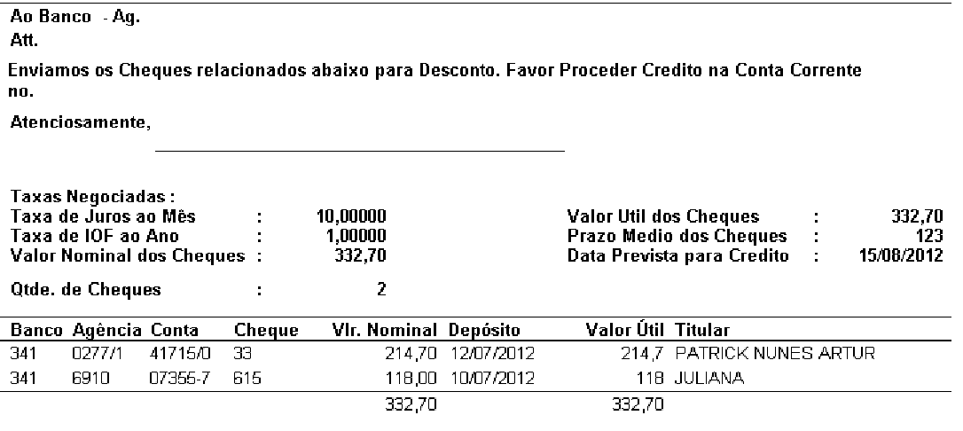 : Conforme nome do Titultr cadastrado ao inserir o cheque;