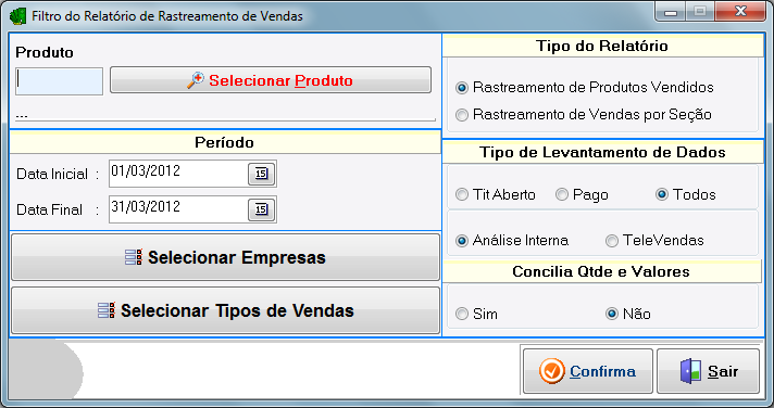 1.Definir o Produto que será rastreado. Prnssione HOME no camPo Produto ou clique em Selecionar Produto. Só selecione o produto para a opção de Rastreamonto de Produtos. 2.Definir o período que se deseja verificar o rastreamento do produto especificado; 3.Em Tipo do Relatório, iremos definsr o RTstredmente de Produtos Vendidos, a.Rastroamonto de Produtos: Você srleciona uc produto e o sistema mostra todos ts clientes que compraram este prpduto no período b.Rastreamento de Seções: Você seleciona as Seções e o sistema mostra os clientes e os produtos que eles compraram, no período, das Seções escolhidas. 4.Tipo de Levantamdnto de Dados a.Títulos Abertos, Pagos ou Todos: permite que você filtre conforme a situação dos cupons de venda em relação ao pagamento b.Analise Interna: Mostra só o nome do cliente. Televendas: mostra nome do cliente, contato de compras e fone. Esta última você pode usar para ligar para cliente e tentar colocar novos pedidos do produto em questão. 5.Em Concilia Qtde e Valoret: a.Sim Mostra os valores totais dos Produtos b.Não Mostra venda por venda 6.Você poderá também definir, em: a.Selecionar Empresas, caso você utilize multilojas você poderá definir quais empresas deverão ser consideradas na composição do relatório; b.Selecionar Tipos de Venda, definir quais os tipos de venda (forma de faturamento) que deverão ser considerados na composição do relatório; 7.Para efetivamente gerar o relatório clique no botão Confirma, caso desista de gerar o relatório apenas clique no botão Sair; Segue um exemplo do relatório de RastreamentR dt Produtos Vendidis: