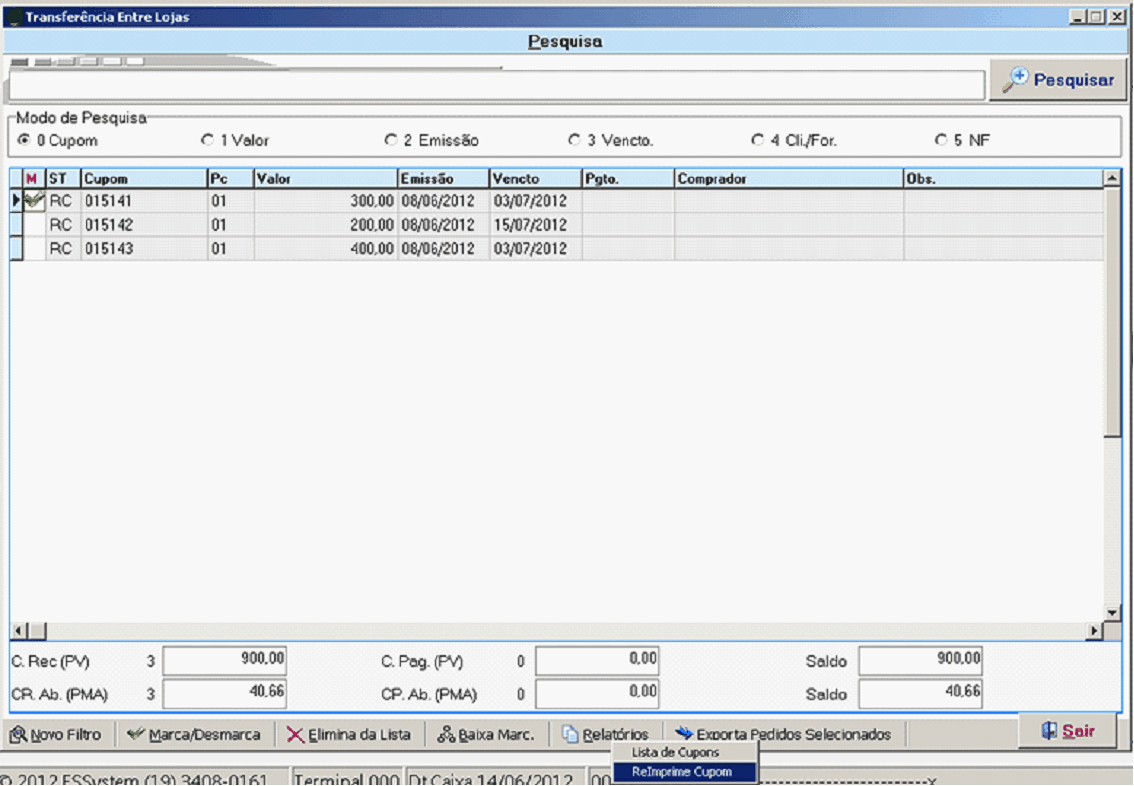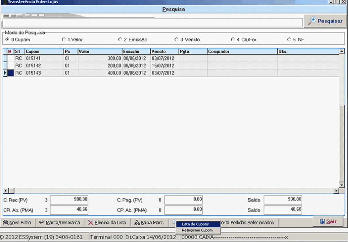 Clicando em .você terá opção de listar os cupons emitidos e reimprimir o cupom que desejar.