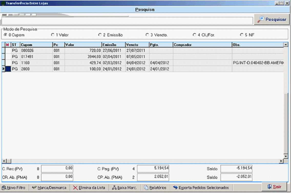 Você ira visualizar todos os cupons que foram fechado com tipo de venda “06” Transferência de filial.
