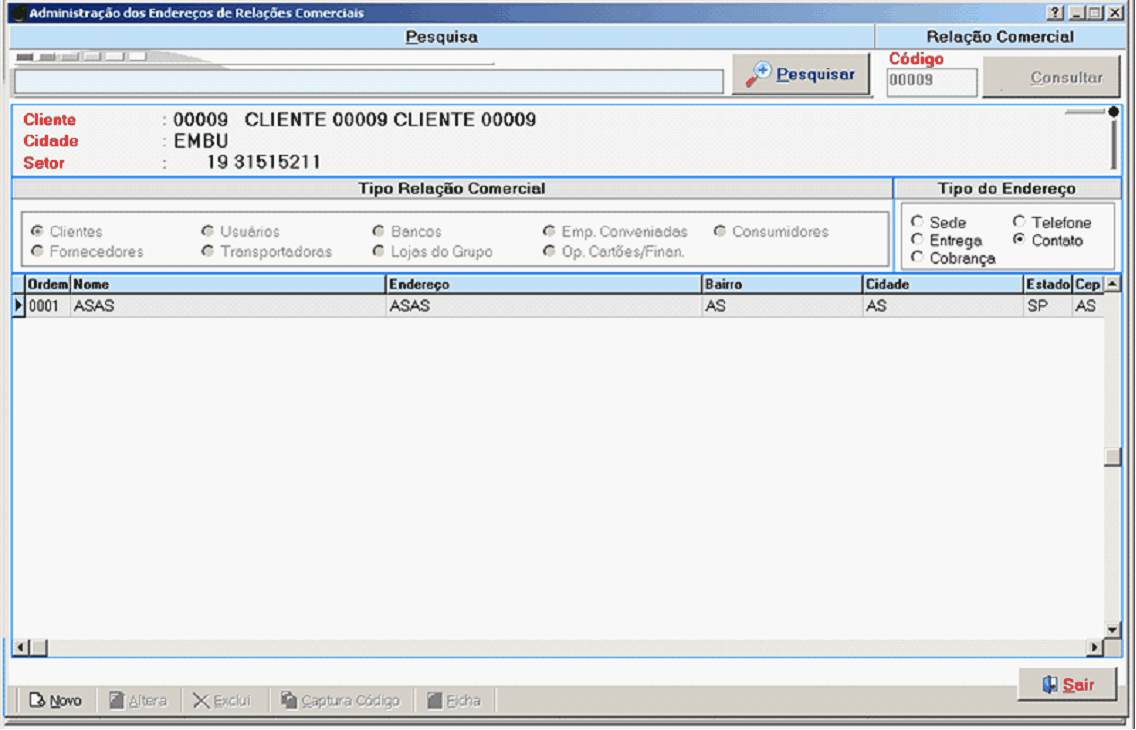 Outra forma é você clicar com o botão direito e escolher “Endereços/Contatos”. Ou então no menu superior, clicar em Cadastro, Altera Endereços. Ou ainda pressionar ALT R.