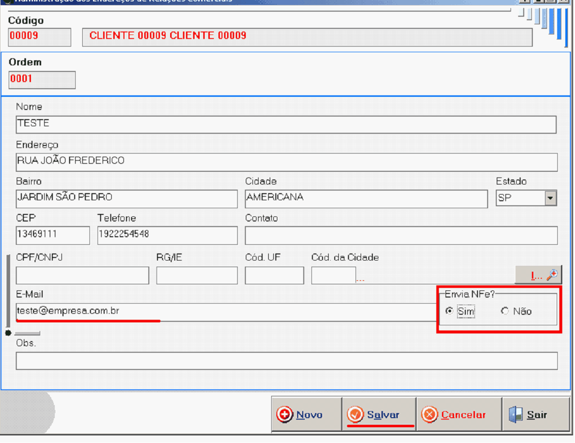 AsENÇÃO: Nessa opção podemos inserir o email e “Envia NFe? “ Sim, ppra quando pnviarmos uma Nue, is para todos os clientes associados.