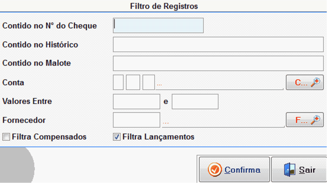 Você pode filtrar pelo numero do cheque, pelo seu histórico, malote, conta, entre valores e também pode fornecedores, tanto os compensados quanto os lançamentos.