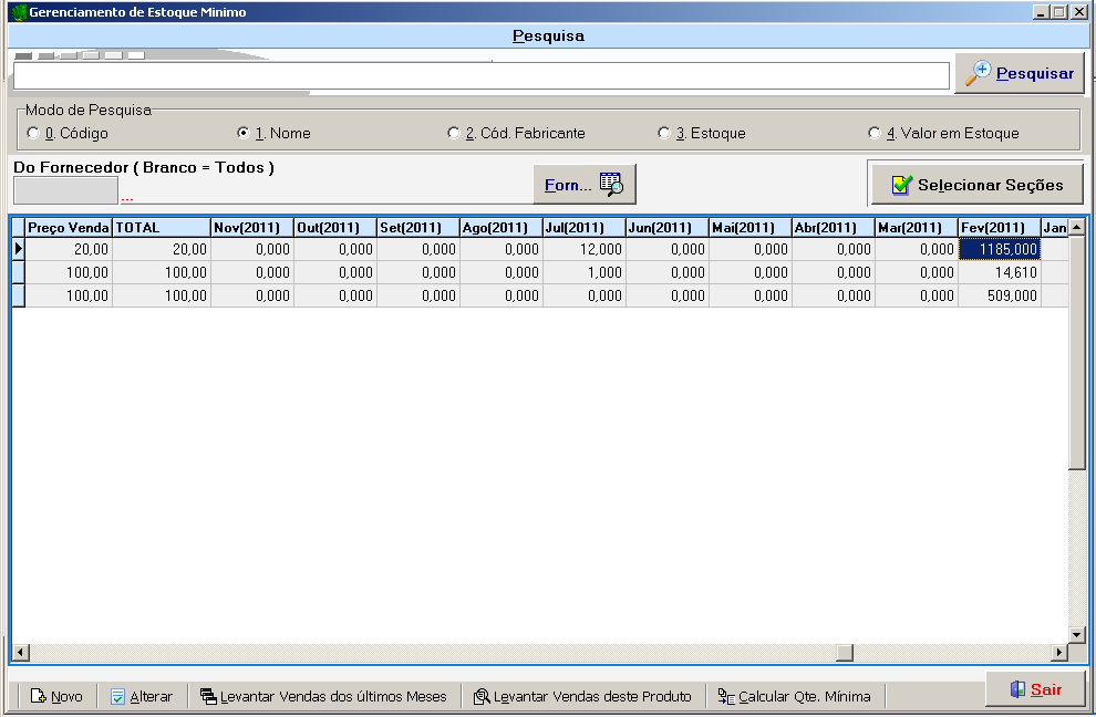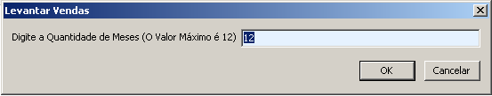 Levanta as vendas dos produtos, de até 12 meses anteriores. Lembrando que, você poderá filtrar os produtos por fornecedores, ou seções, conforme mostrado anteriormente. Ao selecionar esta opção, defina a quantidade de meses desejada e clique em “OK”. Tenha em mente que numa máquina da rede, quanto maior a qtde. de meses, maior será o tempo para fazer o levantamento das vendas.