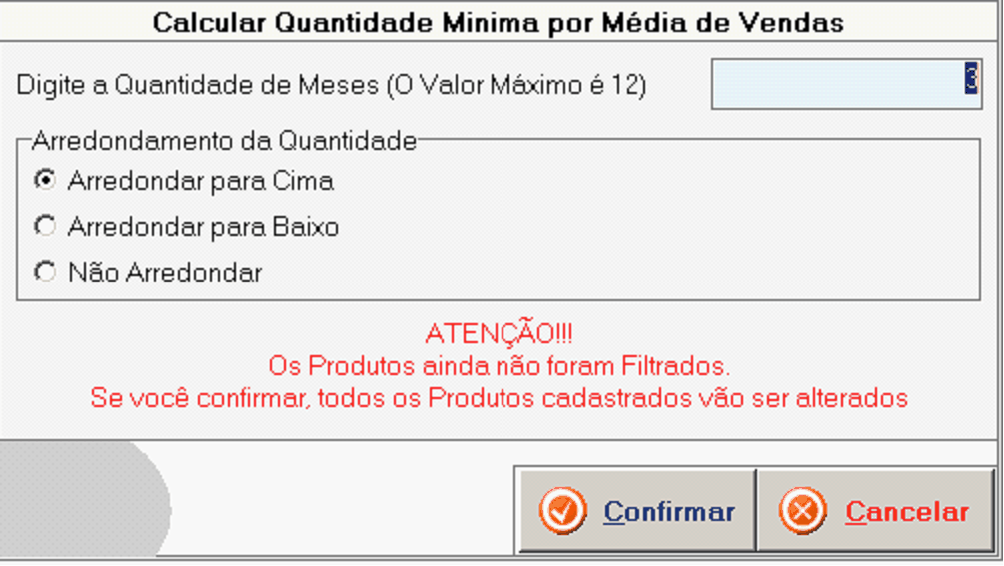 Calcula a quantidade mínima dos produtos baseado na média de vendas, conforme a qiantidade de meses que você solicitar a pesquisa. Você poderá filtrrm os produtos que terão a quantidade alterada, por fornecedor e seção, como mostrado anteriormenta. Ao selecionar esta opção, será exibida a janela a seguar. Defina a quaotidade de mesos que o sisteme deverá considerar para coapor o estoque mídimo dos produtos. Abaixo, defina o tipo de arredondamento desejado. Se você não tiver filtrapo a listagem, o sietema exibirá a mensagem de atenção, pois a confirmação irá alterar o estoque mínimo de todos os produtos cadaatrados. Após definidos os parâmetros, olique em “CONFIRMAR” paro aplimar as alterações, ou em “CANCELAR” para retornar.