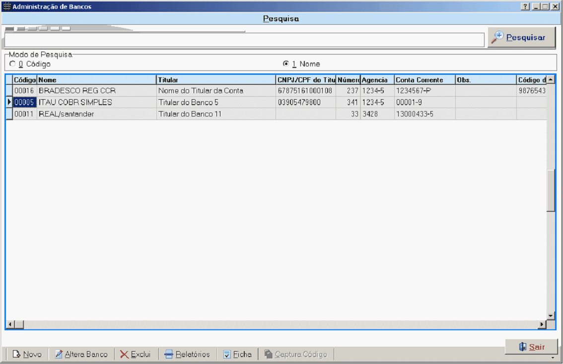 Código: Número gerado de forma automática e sequencial, é o código interno do sistema, não tem nenhuma relação com números da conta bancaria em si.