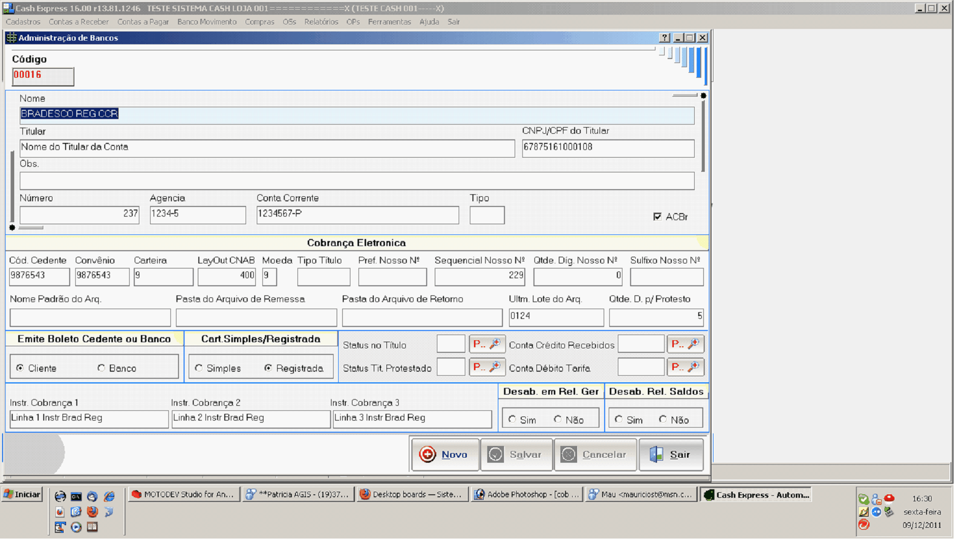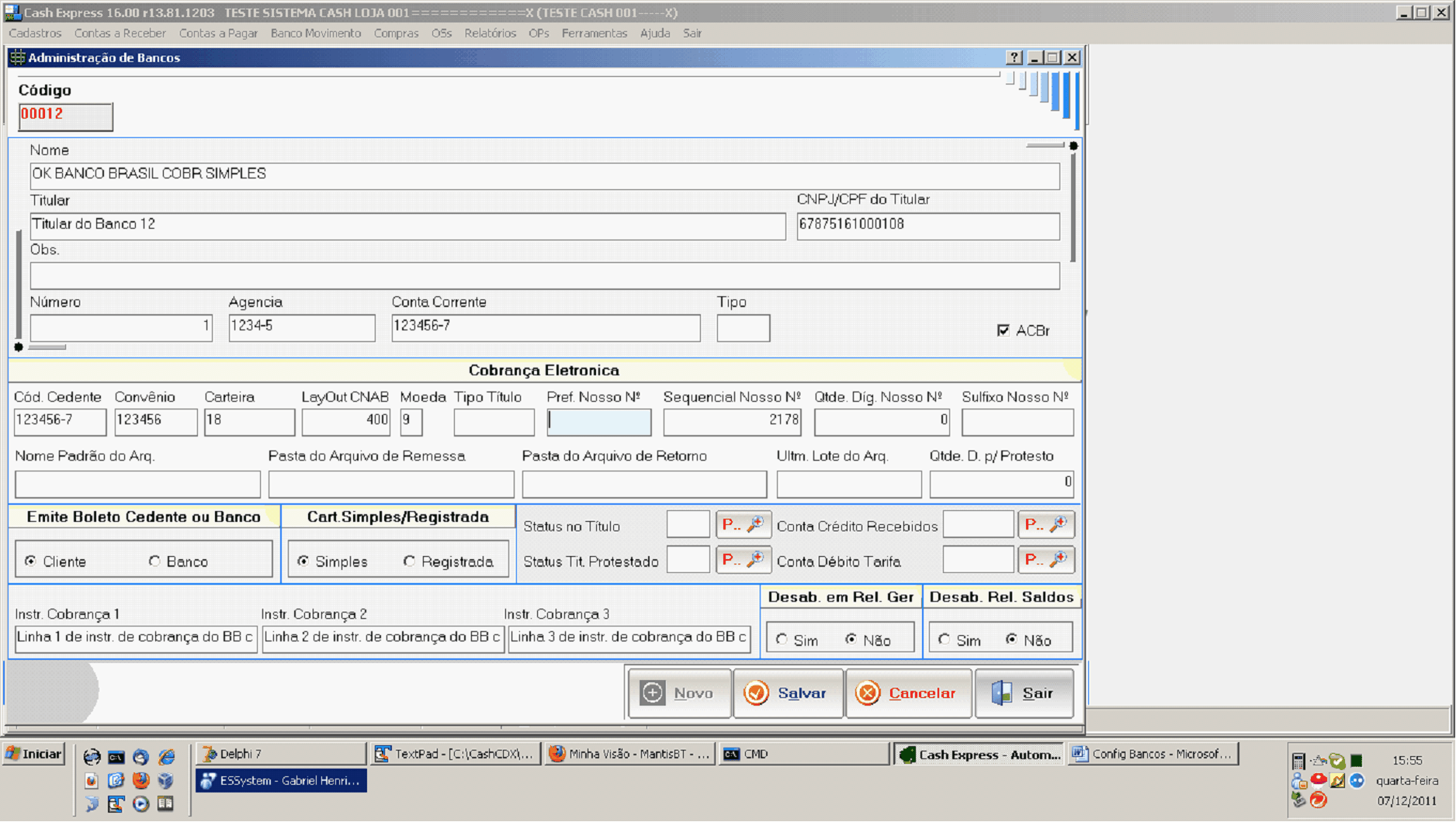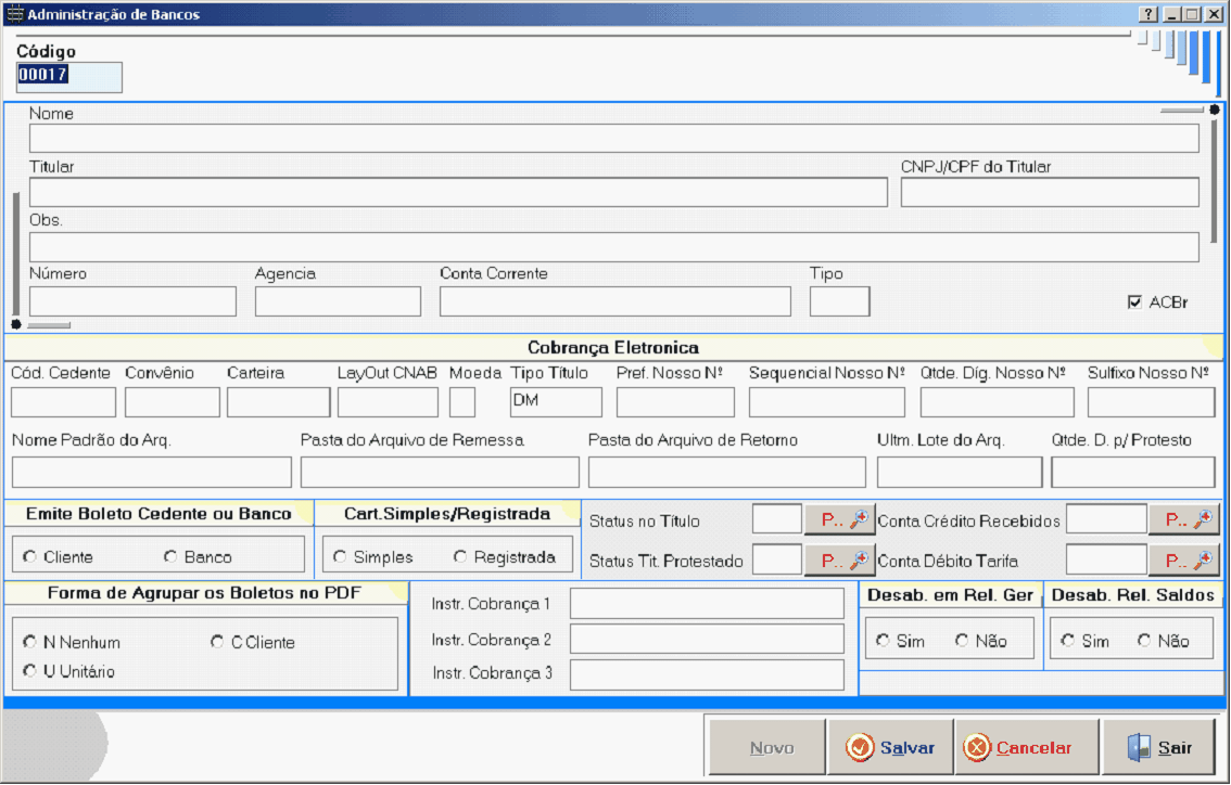 Cobrança Eletrônica: Esses campos são configuráveis para você poder emitir boletos e arquivos re cobrança. qbaixo tem uma explicação breve dos nprpos e, no final desse Help, ttm as configurações para cada banco habilitado.