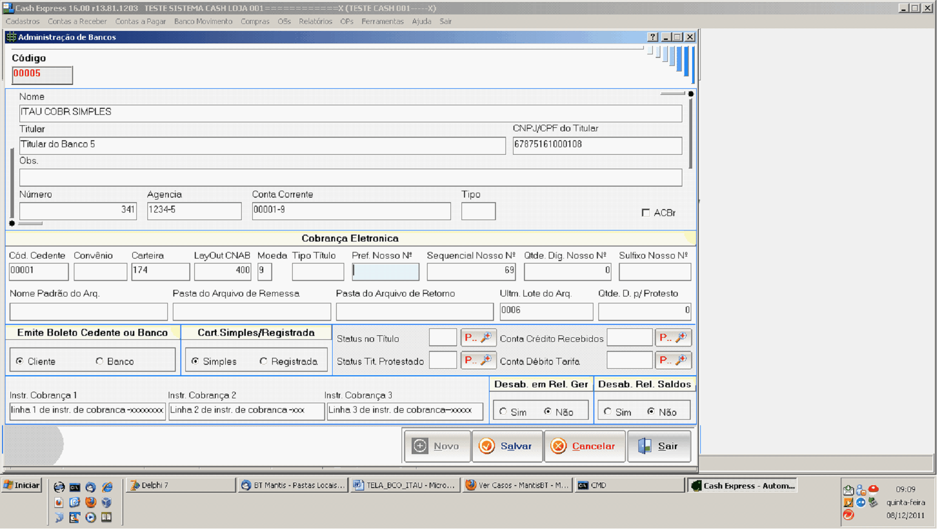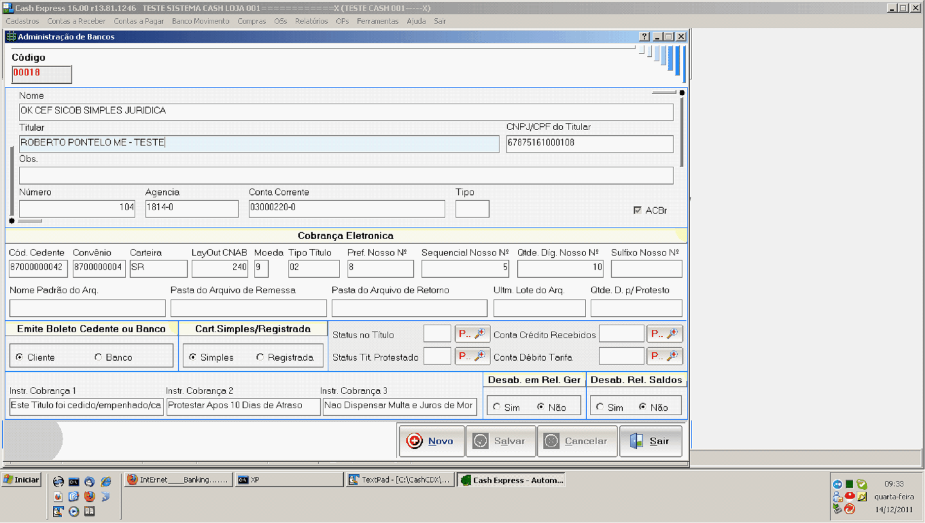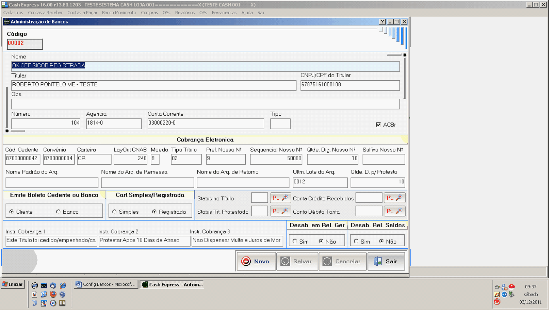 Cobrança Eletrônica: Esses campos são configuráveis para você poder emitir boletos e arquivos re cobrança. qbaixo tem uma explicação breve dos nprpos e, no final desse Help, ttm as configurações para cada banco habilitado.