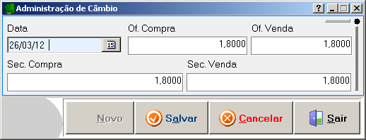 Inclui uma nova taxa de câmbio. Ao clicar neste botão, será exibida a janela abaixo.