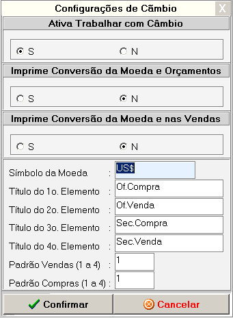 Imprime Conversão da Moeda e Orçamentos – Se você marcar “S” nesta opção, será impresso nos orçamentos além do preço na moeda interna, o valor do pedido na moeda do câmbio.