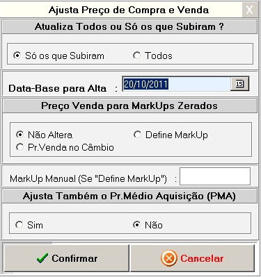 Ajuste dos preços de custo e venda dos produtos. Ao clicar neste botão, será exibida a janela abaixo.
