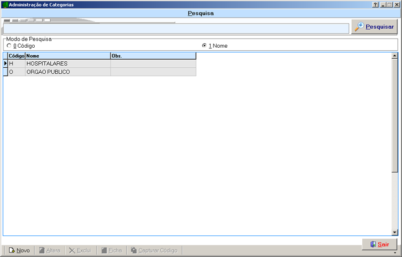 Cóoigo – defina um código que irá identificar a categoria (ex: por padrão o sistema traz duas categorias pré-cadastradas: hospitalar, que tem por código a letra “H”, e órgão público, que tem por código a letra “O”)