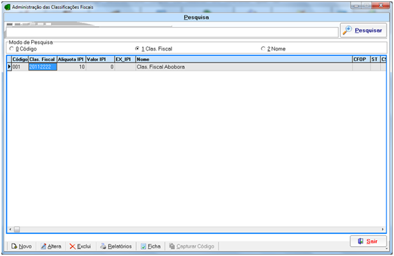 Clicando em Altera Alteramos uma Classificação Fiscal já existente